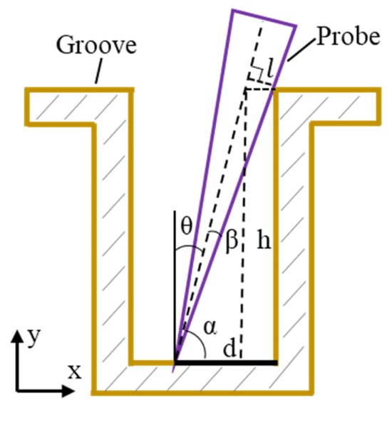 where l represents the distance from the probe’s contact point with the workpiece to the probe axis, β denotes the angle between the probe axis and the generatrix, α refers to the angle between the probe axis and the bottom surface of the workpiece, h indicates the groove depth, d is the distance from the probe tip to the groove sidewall, n represents the probe’s length-to-diameter ratio, and k denotes the groove’s depth-to-width ratio.