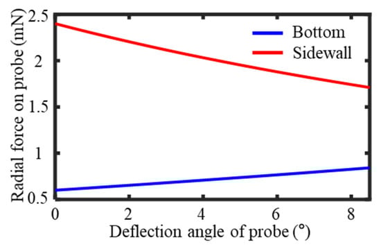 According to the above analysis, it was determined that the probe’s deflection angle range needed to be 0–8.5° to meet the profile stitching requirements for a single measurement. Within this deflection angle range, the force acting perpendicular to the probe’s axis was calculated based on the deflection angle using Equations (9) and (11), as shown in Figure 8. As the probe’s deflection angle increased, the contact force between the probe and the sidewall gradually decreased, while the contact force with the bottom surface continuously increased.