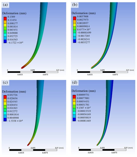 The deformation of the probe was simulated based on the force acting on the probe tip, as shown in Figure 9a–d. The axial and radial deformations of the probe during contact with the groove’s sidewall and bottom surface were calculated for different deflection angles. Due to the probe’s high length-to-diameter ratio, the deformation was primarily concentrated at the probe tip.