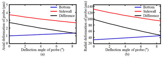 To enhance the stability of the measurement process and minimize the errors, the deformation of the probe needed to remain consistent. It required minimizing the difference between the axial and radial deformation values when the probe contacted the sidewall and bottom surface of the groove. The difference in the axial deformation under varying deflection angles was calculated based on force contact simulations, as shown in Figure 10a. As the deflection angle increased, the difference in the axial deformation between the sidewall and the bottom surface contact decreased. Similarly, as shown in Figure 10b, the difference in the radial deformation also reduced with increasing deflection angles. Therefore, larger deflection angles resulted in a greater measurement stability within the deflection range of 0–8.5°.
