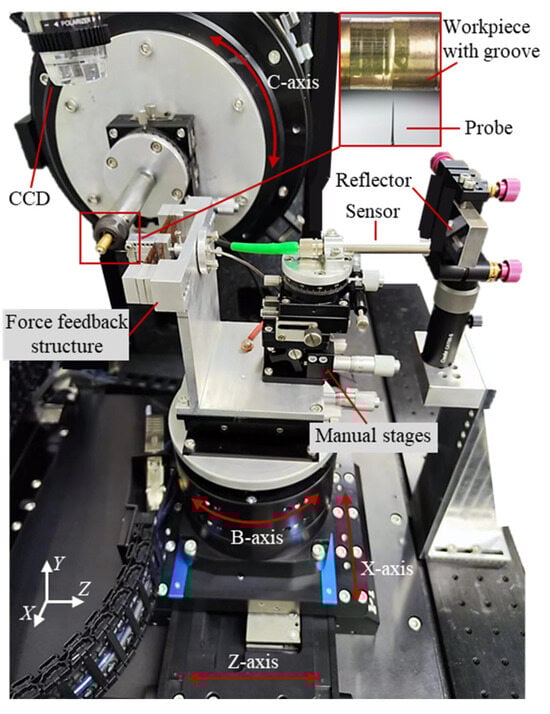 To achieve a full cross-sectional profile measurement of the high-aspect-ratio micro-grooves, a probe scanning measurement device was developed based on the deflected probe-scanning method, as shown in Figure 11. The workpiece with groove features was clamped on the C-axis using a collet chuck. The force feedback structure, which held the probe, was mounted on the X-, Z-, and B-axis combination using a manual displacement stage. This configuration allowed for the adjustment of the relative position between the workpiece and the probe by combining manual displacement stages with motorized axes. The laser sensor was positioned using a manual adjustment stage, which enabled it to measure the fixed reflector on the equipment and output the linearity error of the motion axis. Two sets of CCD sensors arranged orthogonally in the measuring device were used to monitor the measurement position of the probe. During the measurement, the motion axis drove the probe to detect the workpiece profile. The force feedback structure, laser sensor, and motion axes synchronized their outputs, which were subsequently used to reconstruct the groove profile.