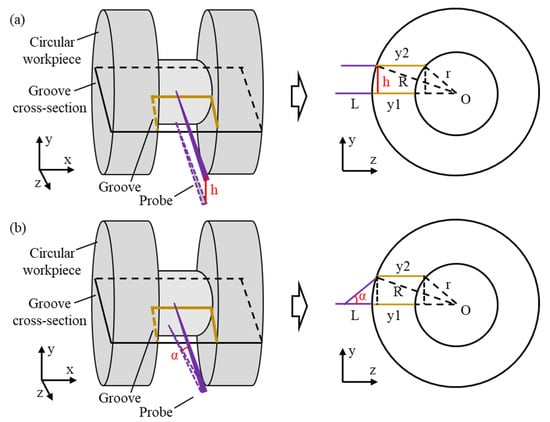 The measurement error model caused by the position deviation of the probe relative to the groove section. (a) The probe with a deviation distance of h. (b) The probe with a deviation angle of α.