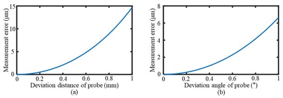 From Equations (12) and (13), it was concluded that the measurement error increased continuously with the probe deviation distance h and the deviation angle α. The variation trends are shown in Figure 14a,b. The measurement errors caused by the probe deviation distance and deviation angle were significant and required a correction of the probe position before measurement to eliminate the positional deviations.