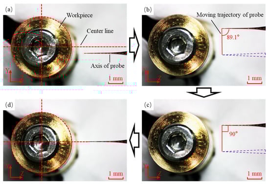 In the Y-Z plane, the probe tilt angle was adjusted to ensure the probe was installed horizontally, with its axis aligned with the maximum diameter direction of the workpiece cross-section. The initial position of the probe in the Y-Z plane is shown in Figure 16a, where the probe exhibited a deviation angle and deviation distance relative to the workpiece. The probe was scanned along the Y-axis, as shown in Figure 16b, and the angle between the probe axis and the scanning trajectory was recorded. The probe position was adjusted to change the angle from 89.1° to 90° by a manual stage, as depicted in Figure 16c. After the angle adjustment process was completed, the probe axis became perpendicular to the Y-axis. The probe was then moved to the maximum diameter of the workpiece cross-section, as shown in Figure 16d. Through the above steps, the probe position adjustment process was completed.