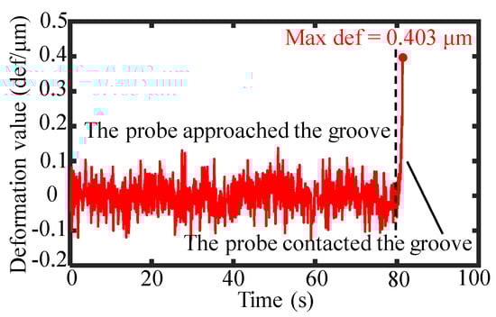 When the probe made contact with the surface of the workpiece, the output of the sensor was approximately 0.4 μm, which was significantly greater than the noise interference signal. During the measurement of the entire cross-section of the groove, if the output of the sensor remained around 0.4 μm, this proved that the probe was constantly in contact with the surface of the workpiece, and the output of the sensor was caused by the deformation of the leaf spring that resulted from the force applied to the probe. According to the output results of the sensor shown in Figure 19, it could be concluded that the probe maintained continuous contact with the workpiece during the scanning process, and the contact force was stable.