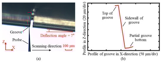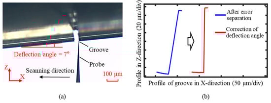 As shown in Figure 22a, after completing the measurement with the probe in its forward deflection position, the probe was reversed to a deflection angle of −7°. The probe was then positioned at the starting point on the right side of the workpiece and scanned in the negative X-axis direction. The measurement procedure was identical to that used for the forward deflection of the probe. After measuring the groove profile, the deflection angle was corrected, and the measurement errors were separated, as illustrated in Figure 22b, which yielded the profile information for the right side of the high-aspect-ratio micro-groove. Through the aforementioned measurement steps, the profiles of both sides of the groove were successfully measured.
