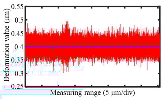 The force feedback structure that held the probe used a capacitive sensor to detect the deformation of the leaf spring, which provided feedback on the workpiece’s profile. During the measurement process, the capacitive sensor continuously outputted data, as shown in Figure 19. The sensor output remained stable at approximately 0.4 μm, with an error of ±0.05 μm, which aligned closely with the system’s predefined value and verified the system’s stability. When measuring the groove sidewalls, the steep inclination of the sidewalls caused fluctuations in the sensor output, which increased the error signal to ±0.1 μm. However, the average output value remained at 0.4 μm, with the error within an acceptable range, which ensured that the groove profile measurement accuracy was unaffected.