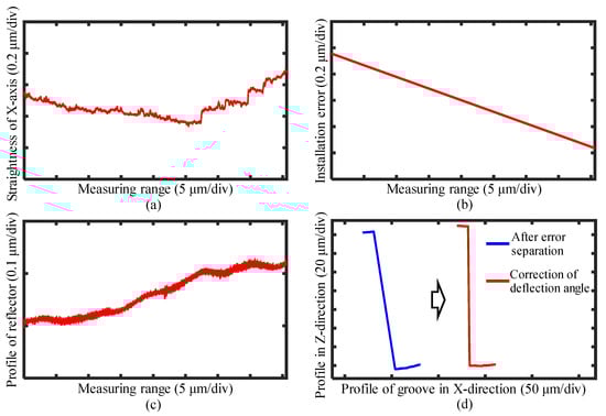 The measurement results obtained by the laser sensor during the probe scanning process are shown in Figure 20a, while the results from the linear scanning along the X-axis are presented in Figure 20b. By combining Equations (14)–(16), all the measurement system errors were successfully separated. The straightness error of the X-axis within the measurement range is illustrated in Figure 21a. The installation error of the reflector separated by the linear fitting is shown in Figure 21b, and the reflector profile information is depicted in Figure 21c. After separating these errors from the groove profile measurement results, the tilt angle of the workpiece relative to the scanning probe was corrected based on the pre-set tilt angle. The corrected groove profile is presented in Figure 21d.