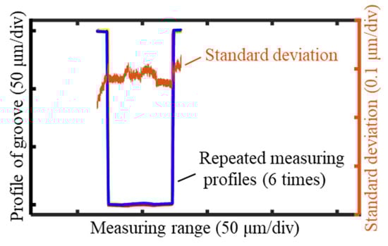 The measured standard deviation of 82 nm included the effective profiles of the groove’s sidewalls and bottom and the planar region at the top of the groove. When evaluating the measurement accuracy of the groove profile, the planar region at the top of the groove could be excluded, with a sole focus on the profiles of the sidewalls and bottom. The standard deviation increased progressively from the left to the right side of the groove, where the planar region at the top of the right side exhibited the highest standard deviation. Therefore, by excluding the planar region at the top, which was not required for assessing machining accuracy, the repeatability of the measurement system was found to be better than 82 nm.
