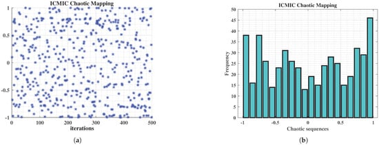 ICMIC chaotic mapping. (a) Scatter plot; (b) probability histogram.
