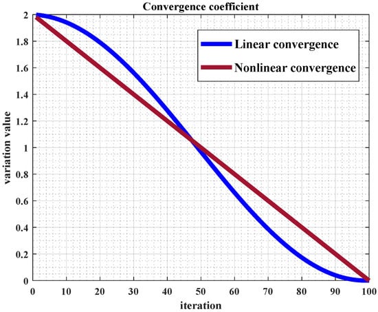 In the WOA, the convergence coefficient plays a crucial role in determining the algorithm’s search efficiency. In the conventional WOA framework, follows a linear decay from 2 to 0. While this approach facilitates strong global exploration in the initial stages, it often results in slow convergence. In later iterations, although the convergence rate increases, the algorithm is prone to becoming trapped in local optima, particularly when solving multimodal optimization problems.