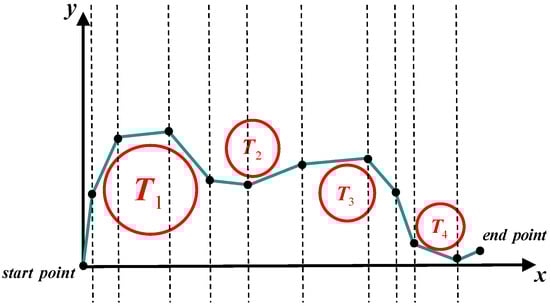 When performing path planning, it is crucial to consider not only the length and algorithm runtime but also additional factors, such as collision avoidance, smoothness, and flight altitude, due to the complexity of the environments encountered. In this study, the UAV’s coordinates in a three-dimensional environment are represented by . The path points are first identified through the optimization algorithm, followed by interpolation, ultimately yielding a complete path, as illustrated in Figure 3.