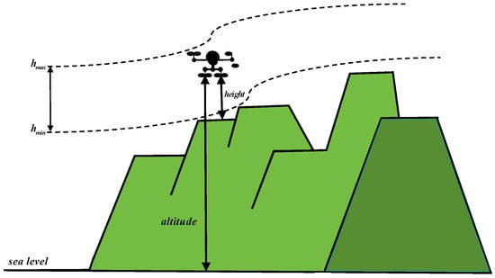 During flight, altitude is a critical factor that influences both mission safety and efficiency. Adjusting flight altitude allows UAVs to avoid obstacles and comply with airspace regulations, particularly in complex environments such as urban areas and mountainous terrains. Optimizing flight altitude reduces the risk of collisions and improves mission success rates. Moreover, altitude directly impacts energy consumption and overall flight efficiency. Higher altitudes may offer more favorable wind conditions and reduced air resistance, potentially lowering energy expenditure. However, excessive altitude increases the power requirements for lift and propulsion. Consequently, optimizing flight altitude requires a balance between energy efficiency and safe navigation, as depicted in Figure 4. The evaluation of flight altitude in this study is represented by Equation (20).
