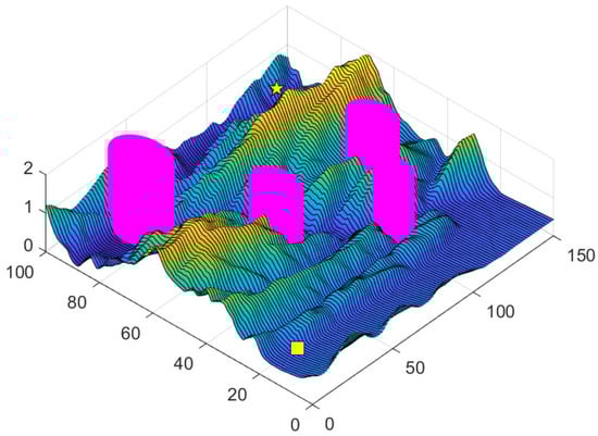 In this section, a mountain model with dimensions is employed for path-planning simulations, assuming idealized environmental and weather conditions. Several no-fly zones, including air defense and radar monitoring areas, are designated within the mountainous terrain, as depicted in Figure 7.