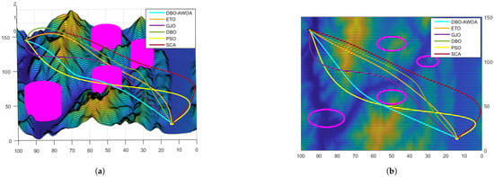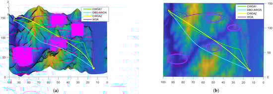 Figure 11b presents the fitness comparisons across different algorithms. DBO-AWOA rapidly converges to the optimal path while efficiently refining the solution through local exploration. In contrast, other algorithms exhibit more erratic behavior, characterized by drastic fluctuations and higher randomness in optimization, leading to significantly less consistent path quality compared to DBO-AWOA.