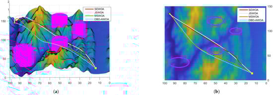 Figure 11a presents the fitness comparisons across the variants of WOA, further underscoring the superiority of DBO-AWOA in UAV path planning. The proposed approach effectively escapes local optima, demonstrating strong robustness. Among the tested methods, DBO-AWOA achieves the lowest fitness value of 56.22, outperforming MSWOA (59.19) and significantly surpassing WOA (89.51). Compared to other optimization strategies, DBO-AWOA improves fitness by 5.1% to 38.2%, highlighting its capability to generate optimal paths in complex mountainous terrains where other algorithms struggle or incur higher path costs.