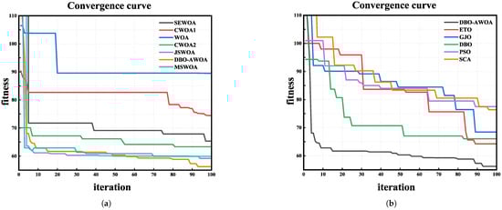 To thoroughly assess the convergence ability and robustness of the proposed DBO-AWOA algorithm, extensive experiments were conducted using the CEC2017 benchmark suite [], which consists of 30 test functions grouped into four categories: unimodal (F1 and F3), simple multimodal (F4–F10), hybrid (F11–F20), and composition functions (F21–F30). The specific functions utilized in this study are summarized in Table 1. A comparative analysis was carried out against six state-of-the-art variants: WOA [], CWOA1 [], CWOA2 [], SEWOA [], and MSWOA [], JSWOA []. The parameter settings for all algorithms are detailed in Table 2. Performance metrics, including minimum (Min), average (Avg), and standard deviation (Std) values, were calculated over 30 independent runs. The benchmark function evaluation results are presented in Table 3.