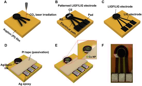 Schematic of the fabrication process: (A) CO2 irradiation of PI film to form the LIGF/LIG electrode pattern, (B) fabricated LIGF/LIG electrode-based sensor, (C) removal of LIGF from the electrical path and pad with N2 gas stream, (D) formation of Ag/AgCl electrode in RE area and preparation of the passivation layer with PI tape and Ag epoxy, (E) completed Cu NP/LIGF/LIG electrode-based glucose sensor obtained by electroplating Cu NPs on the WE area, (F) photograph of the fabricated Cu NP/LIGF/LIG electrode-based glucose sensor.
