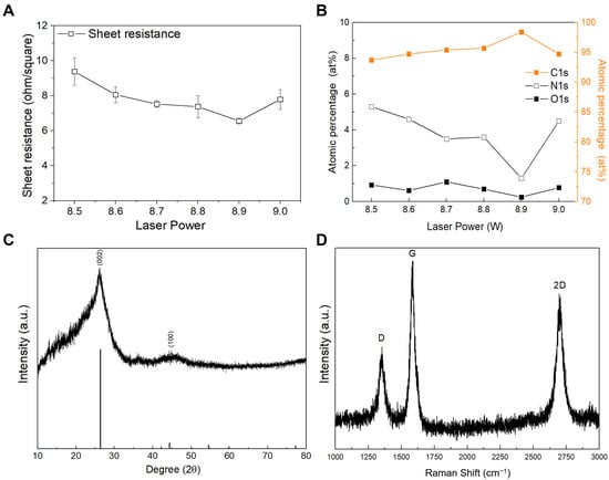 (A) Measured sheet resistance and (B) XPS results showing atomic percentages of C1s, O1s, and N1s of the fabricated LIGF/LIG electrodes at laser powers of 8.5, 8.6, 8.7, 8.8, 8.9, and 9 W. (C) XRD pattern and (D) Raman spectrum of the fabricated LIGF/LIG electrode at 8.9 W.