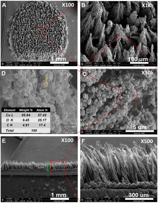 FE-SEM images of the top view of (A) the fabricated Cu NP/LIGF/LIG electrode (×100), (B) Cu NP-coated LIGF (×1k), (C) Cu NP-coated LIGF (×30k) at higher magnification, (D) EDS results for the Cu-NP-coated LIGF/LIG electrode, and (E,F) a cross-sectional view of the LIGF/LIG electrode fabricated under an 8.9 W laser power.