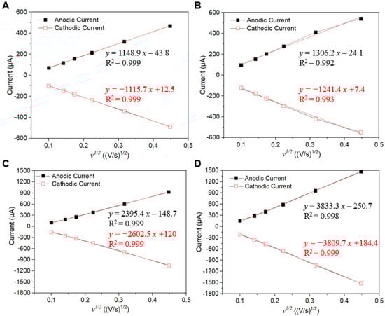 where D is the diffusion coefficient of the analyte. Therefore, using the constant values of the parameters D, C, and n, we could successfully obtain approximate values of A and D according to the Randles–Sevcik equation.