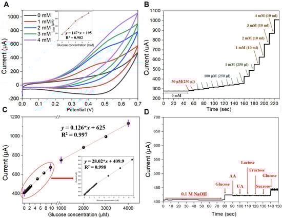 The CV curves of the fabricated Cu NP/LIGF/LIG electrode-based glucose sensor were obtained under 100 mV/s at a scan rate from 0 to +1 V using a 0.1 M NaOH solution with different glucose concentrations (Figure 5A). The CV oxidation peak current at +600 mV was found to increase in proportion to the glucose concentration, resulting in a high linear correlation constant (i.e., R2 = 0.997, yIpeak = 125.2x + 504, where x is the glucose concentration), as shown in the inset of Figure 5A. This good linearity of the measured current value demonstrates the electrochemical feasibility of the Cu NP/LIGF/LIG electrode as a glucose sensor. The mechanism for the oxidation of glucose by the Cu NP/LIGF/LIG electrode in the 0.1 M NaOH solution is as follows [,]: