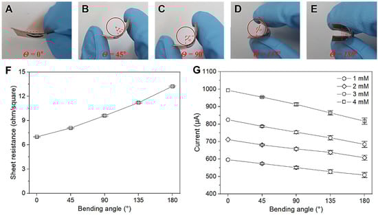 Cu NP/LIGF/LIG electrode-based glucose sensor in bent states with different bending angles (θ) for sheet resistance and CV measurements: (A) 0°, (B) 45°, (C) 90°, (D) 135°, and (E) 180°. In (B–E), the curvature radius is 1 cm. (F) Sheet resistance and (G) CV results of Cu NP/LIGF/LIG-electrode-based glucose sensor at glucose concentrations of 1, 2, 3, and 4 mM for each bending angle.