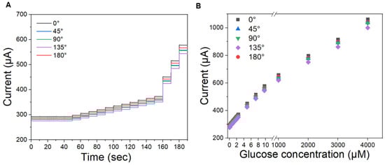 (A) Amperometric current response at +600 mV with time of applying different glucose concentrations for five different bending angles and (B) amperometric current response with respect to glucose concentration to investigate its linearity at bending angles of 0°, 45°, 90°, 135°, and 180°.