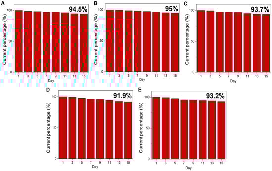 Stability of the fabricated Cu NP/LIGF/LIG electrode stored at ambient conditions over 15 days with the addition of 1 mM glucose under bending state at (A) 0°, (B) 45°, (C) 90°, (D) 135°, and (E) 180°.