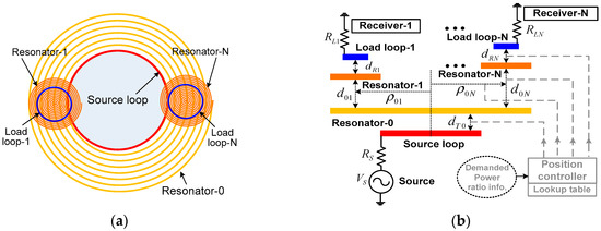 Figure 1 shows a schematic of the proposed asymmetric WPT system with multiple receivers. A transmitter (receiver) consists of a pair of coils, which is a source (load) loop and a resonator. For high-quality factors, transmitting resonator-0 has multiple turns and uses self-capacitance for resonance. The size of the receiving resonator-i (i = 1 − N) is relatively smaller than the transmitting resonator-0, and lumped capacitors are used for resonance. The source loop is connected to a power source with resistance , and it is in coaxial alignment with transmitting resonator-0 at a distance . The load loop-i connected to the load has a distance from the receiving resonator-i. Between the resonator-i and resonator-0, there is a vertical distance of and lateral displacement of from the center of the resonator-0. This prototype uses power sensors to achieve the demanded power ratio. The system can add a position controller and a lookup table (not implemented in this prototype) for automated control. The lookup table can store the values of parameter sets (, , and ) corresponding to the measured power value. When the information for the desired power ratio is input, the controller can move the coils to the desired locations.