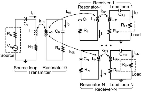 Equivalent circuit of the resonator-coupled WPT system with one transmitter and N receivers.