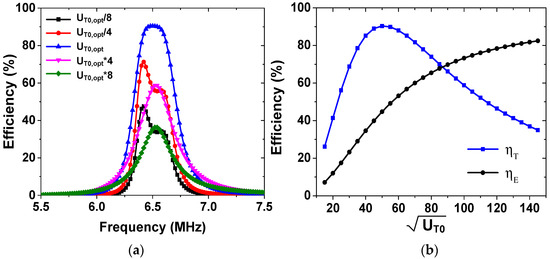 Figure 4a shows simulated as a function of frequency for different values of . The Advanced Design System is used for circuit simulations, with the parameters shown in Table 1. All coils and resonators are assumed to have the same frequency ( = 6.5 MHz). The peak efficiency of 90.4% at 6.5 MHz is achieved when = is used. When deviates from , decreases, and the frequency where the peak efficiency occurs shifts to a lower frequency. Figure 4b shows the calculated and as a function of . increases up to 82.5% at = 145. A peak value of 90.4% is achieved at = 50, with a corresponding value of 44.7%.