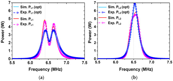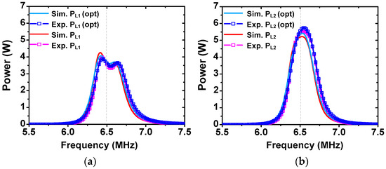 Figure 6 shows the measured and simulated and of the two receivers when = 10 W. Before tuning , the simulated power ratio is = 5.21 W/3.59 W = 1.45. The measured ratio is = 5.44 W/3.55 W = 1.53 at 6.5 MHz, which is close to target values. After tuning optimization, it shows a simulated = 5.35 W/3.69 W= 1.45 and measured = 5.55 W/3.62 W= 1.53. The result shows that is close to the target value of 1.5 both before and after optimization. After tuning for impedance matching, the measured and are slightly improved by 0.07 W and 0.11 W, respectively; the initial position of the source loop ( cm) is close to cm. After tuning, improves from 89.9% to 91.7%. The parameters of the transmitter and receiver used for the experiment are listed in Table 3 and Table 4, respectively.