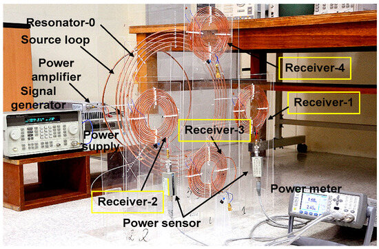 Experimental setup of the resonator-coupled WPT system for powering four receivers.