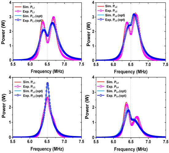 Figure 9 shows the measured and simulated load power of four receivers. Before tuning , the simulated values are = 1.97 W/1.36 W = 1.45, = 2.63 W/1.36 W = 1.93, and = 1.03 W/1.36 W = 0.76 at 6.5 MHz. The measured values are = 1.82 W/1.25 W = 1.46, = 2.62 W/1.25 W = 2.1, and = 0.92 W/1.25 W = 0.74. The division ratios are close to the target value. The small difference can be attributed to slightly different resonant frequencies of coils and non-zero cross-couplings. After achieving the power ratios, is tuned to achieve the peak value. The experimentally determined value for peak is 7 cm. The measured division ratios are = 2.45/1.69 = 1.45, = 3.53/1.69 = 2.09, and = 1.33/1.69 = 0.79. The power ratios after tuning are maintained as relatively constant; the power delivered to loads is improved by 0.44 W for , 0.63 W for , 0.91 W for , and 0.41 W for . After tuning, is significantly improved from 66.1% to 90%. The results show that the proposed WPT system can achieve the target power division for the four receivers with a relatively high efficiency. The parameters of the four receivers used for the experiment are listed in Table 5.