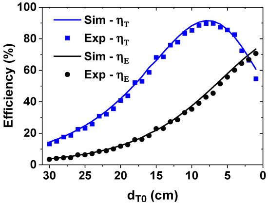 Figure 10 shows the simulated and calculated efficiencies as a function of . The result shows that peak = 89.9% is achieved at = 7 cm, with a corresponding value of 45.4%. increases with decreasing , reaching 70.7% at = 1 cm. The measured results show a relatively good agreement with the simulated data. Among the variable parameters (, , and ) considered in this work, and are adjusted while and are fixed during the experiment to simplify the experimental procedure. Therefore, the two parameters ( and ) can also affect the efficiency when they are varied. To determine the four variables for the demanded power ratio, in this prototype, power sensors are used. In practical applications demanding automated control, measured power values corresponding to the four variables can be stored in the lookup table (see Figure 1). When the desired power ratio information is input to the position controller, the position information is retrieved from the table, and positioning control can be performed using the parameter sets (, , and ).