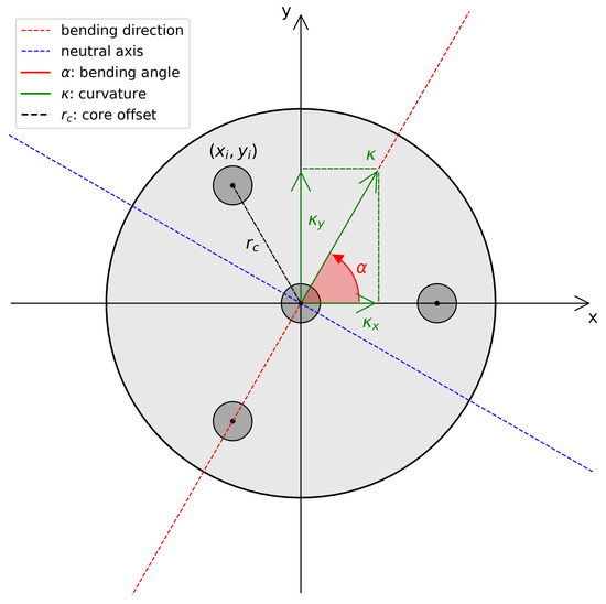The bending is represented by the curvature vector , which is defined by its modulus and the angle with respect to the reference frame. In this situation, a certain fiber core centered at coordinates with respect to the center of the cable will experience a strain due to bending equal to