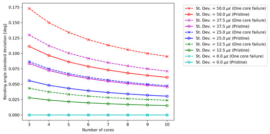 Effect of core number on the bending angle standard deviation for the pristine optical fiber (“o” marks), and in the case of one core failure (“x” marks).