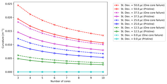 Effect of core number on the curvature for the pristine optical fiber (“o” marks), and in the case of one core failure (“x” marks).
