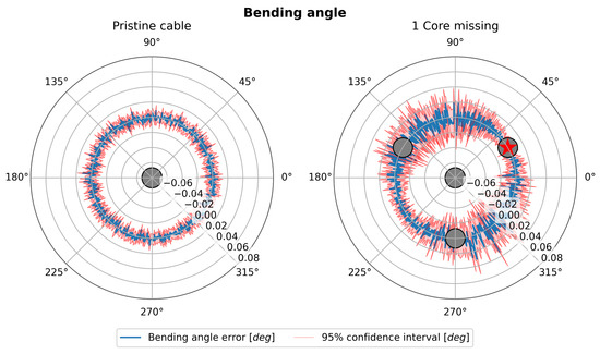 Figure 6 (left and right) shows the trend of the bending angle error (blue line) as the bending angle itself varies in a polar representation for a shape sensing cable with four cores. The 95% confidence intervals (C.I.) are shown in red. When comparing a perfectly functional sensing cable, as shown in Figure 6 (left), with the case where one core is damaged, as shown in Figure 6 (right), a clear increase in uncertainty in the estimate of the bending angle is evident. Moreover, while the uncertainty in the pristine case has no preferential direction, the symmetry is broken in the damaged case. The uncertainty in estimating the bending angle reaches the maximum when said angle is 90° away from the damaged core. As shown in Figure 2, this corresponds to the broken core lying along the neutral axis of the cable section. This result can be interpreted by considering that the core that is located along the neutral axis of the cable by definition incorporates the information of the bending angle direction and is therefore the most important for its estimation.