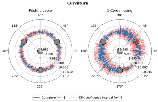Similarly, Figure 7 (left and right) shows the curvature trend (blue line) as the bending angle varies in a polar representation for the same shape sensing cable with four cores. Also, in this case, the 95% C.I. are shown in red. The comparison in the case where the cable is perfectly functional, Figure 7 (left), with the case where one core is damaged, Figure 7 (right), again shows an increase in uncertainty that depends on the value of the bending angle.