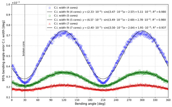 The results are presented in Figure 8 and Figure 9, which depict the 95% C.I. widths as functions of the bending angle (in degrees) for different numbers of cores in the damaged case. Figure 8 illustrates the bending angle error, while Figure 9 shows the curvature.