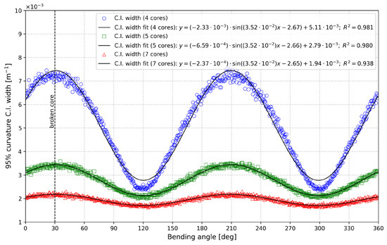 From a first qualitative analysis, the comparison of Figure 4 and Figure 5 suggests that fiber failure causes a much more severe increase in uncertainty for bending angle compared to curvature: when a core is missing, increases by a value ranging from 55% to 56%, while increases by a factor ranging from 25% to 26% in the cases taken into account in this work [25]. It is also important to note that, even if the overall noise changes with the number of cores, these factors appear to remain constant.