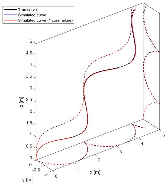 Up to this point, we have focused on the effect of the loss of a sensing core on the measurement of the curvature vector in a single sensing point. In this section, we focus on how core failure affects the reconstruction of an entire 3D curve. First, using the process described in Section 2.3.2, we generate a right-handed helix curve (defined by a constant curvature of 1 m−1 and a torsion of 1 rad/m) with an arbitrary length of 10 m and 1000 sensing points to better control the evolution of the error. Monte Carlo simulations for sensing cables with a variable number of sensing cores, both pristine and with one missing core, are performed with 10,000 iterations. The shape obtained in one Monte Carlo iteration is shown in Figure 10 for illustrative purposes.