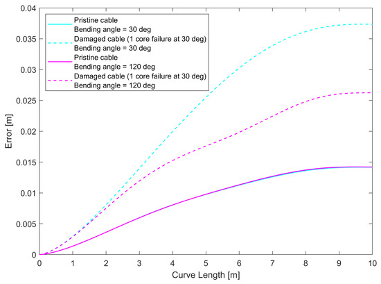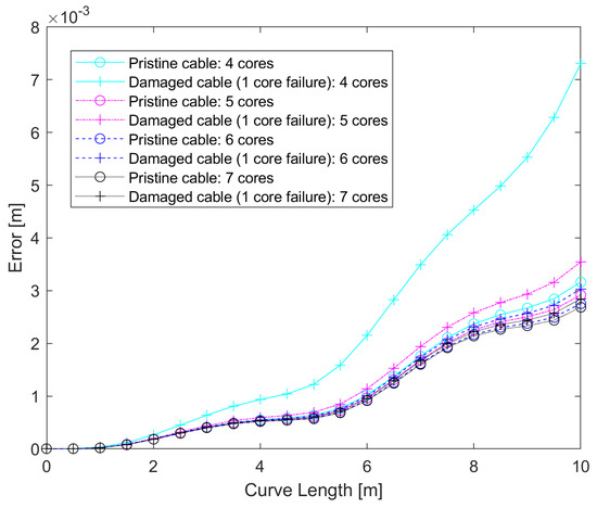 Figure 11 shows the average of the errors at every point of the curve for all iterations, which shows that the error tends to increase along the curve as the effect of noise is compounded, as expected, and that the differences between pristine and damaged cables tend to increase, but that this effect quickly decreases as the number of cores is reduced. Table 2 shows the highest error (found at the final point of the curve) for pristine and damaged cables, as well as the ratio between the two. The error ratio decreases by 46.9% as the number of cores increases from four to five cores. However, the improvement becomes less evident as the number of cores increases, with six and seven cores already showing similar results (only 2.8% of error ratio reduction).