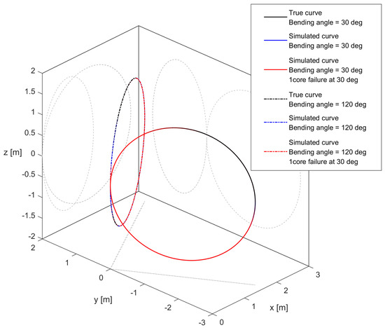 There are three potential points of novelty for this work: first, this is the first paper that considers the possibility of measurement in the presence of core failure and how it can still be performed. Second, this work reveals non-trivial results indicating that the loss of symmetry in the sensing cable results in a measurement accuracy that is asymmetrical with respect to the bending direction, and the nature of this asymmetry, which has implications in practical applications where the performance of a broken sensing core must be characterized, especially for shapes lying on a plane (i.e., with a preferential bending direction). Third, we were able to provide guidelines for the sensor design, indicating a specific cable configuration (four outer cores + one central core) as the best compromise between low accuracy loss from core breakage and low design complexity.