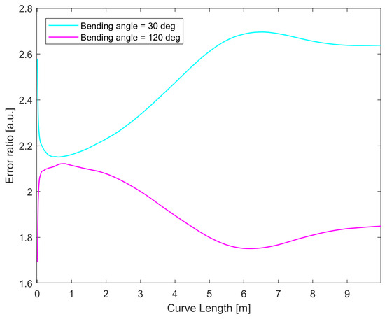 While the helix simulation provides some insight, the curve does not allow us to see the effect of asymmetry in noise measurement for curvature and bending angle in the presence of core breakage, since the bending angle changes constantly along the curve, due to the non-zero torsion. As a further test, we chose to perform the simulation for curves lying on a plane, such as those shown in Figure 12: we simulated shape sensing for a pristine and damaged cable along two different circles (a shape with a constant curvature and bending angle), where the bending angle was equal to 30° (that is, the curvature vector passes along the damaged core), or 120° (that is, the curvature vector is perpendicular to the axis containing the damaged core). As shown in the previous section, for 30°, the error reached the maximum for the curvature and minimum for the bending angle, and vice versa for 120°. We simulated the 3D reconstruction following the procedure described in Section 2.3.2 for the four following situations: circle at 30° using an intact cable, circle at 30° using a cable with a broken core, and the same two cases for 120°. The errors along the curve length are shown in Figure 13, and the error ratios between the damaged and pristine cable for the two curves are shown in Figure 14. What can be seen from this last figure is that the noise increase is more stark when the curvature vector is oriented in such a way that the noise of the curvature is at its maximum.