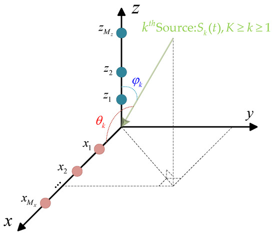 Let us consider an L-shaped array composed of two linear orthogonal arrays, with and elements located at positions and , respectively, as shown in Figure 1. We further assume that narrowband far-field sources are in the surveillance region, impinging on the L-shaped array from , , where represents the angle between the incident direction and the -axis, while is the angle relative to the -axis. Then, the received signals on the L-shaped array in the -axis and -axis subarrays are obtained as