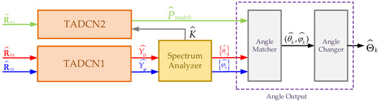 - The estimation cross-covariance matrix of the received signals from the -axis and -axis subarrays is as the input of the angle matching network (TADCN2), which outputs the probabilities of different angle combinations generated by the possible values of all elements in the sets and .