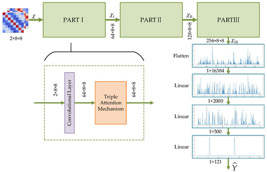 The inputs to the TADCN1 model are the estimation covariance matrices and , which are split into the real part and the imaginary part as two channels to facilitate network processing. The overall structure of the TADCN1 model is shown in Figure 4. There are three network architectures with the same structure, PARTI, PARTII, and PARTIII, to deal with the two channels including comprehensive signal feature information to progressively analyze and extract deeper angle information. As shown in Figure 4, PARTI consists of a convolutional layer and a TAM layer. After each convolutional layer, a TAM module is added to enhance feature representation. Each layer uses the Leaky ReLU activation function, which is similar to ReLU but outputs a small linear portion when the input is less than or equal to zero. This process is especially useful in deep networks to avoid the ‘dead neuron’ problem. Finally, the features extracted from PARTIII are flattened into a one-dimensional vector which is fed into fully connected layers to reduce the dimensionality gradually and convert the features into an estimated pseudo-spectrum.